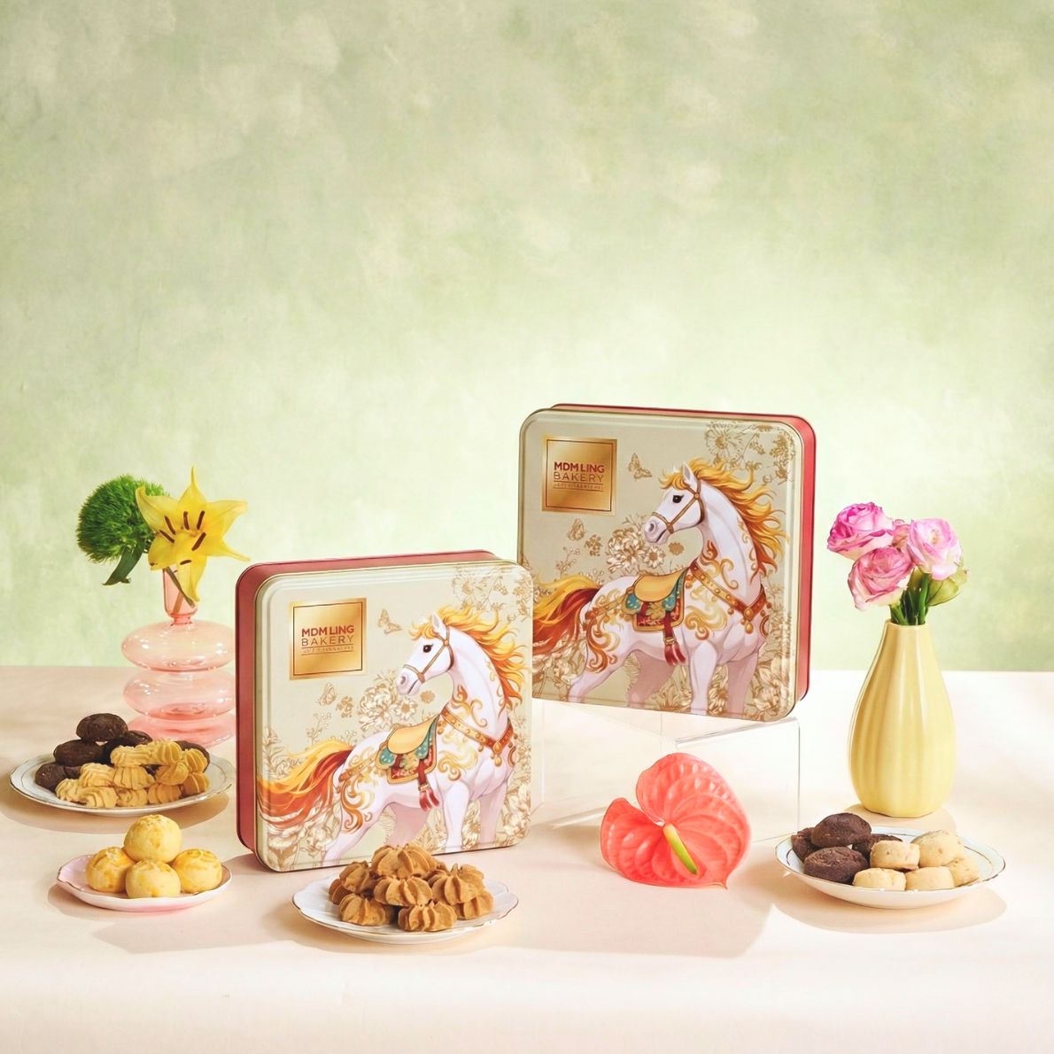 The cool, contemporary mint hue sets the stage for a dynamic horse motif, representing swift success and boundless energy this CNY 2026!